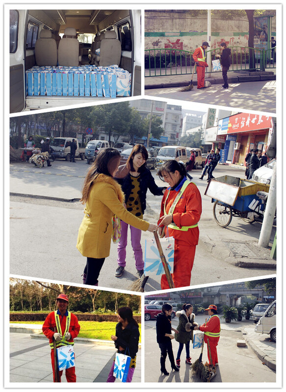 清晨東方未見光,寒氣襲人透身涼。千家萬戶尚熟睡,環衛工人已上崗。手握笤帚掃垃圾,推著車子串街巷。我們沿著北苑路、望道路、丹溪路、雪峰路、市民廣場等沿城區主要街道,一路下來尋找環衛工人的身影。賽爾集團的志愿者們考慮到環衛工人的工作性質,特地為他們準備了保溫杯、熱水袋、棉襪、板藍根等。當志愿者們把一份份“愛心”送到他們手里時,他們的激動之情溢于言表,紛紛對賽爾集團的志愿者們表示感謝。