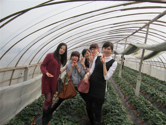 大約下午一點在農莊吃過午餐后,大家才陸續的進入草莓棚??粗锏乩?,小如子彈、大如拇指的草莓,忍不住垂涎欲滴。同事們都很興奮,彎著腰,輕巧地采擷,雖然果實并非個個飽滿,但笑容仍蕩漾在臉上,這場面貌似是一幅畫,染著這個春意正濃的季節。在夕陽西落前,我們便離開農莊前往天一豪食匯,共享饕餮大餐。