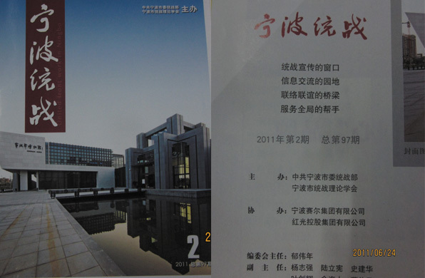 日前寧波賽爾集團和紅光控股集團共同出資協辦寧波市委統戰部主辦的《寧波統戰》雜志。《寧波統戰》是我市統一戰線的核心期刊,是統戰宣傳的窗口,信息交流的園地,聯絡聯誼的橋梁,服務全局的幫手。作為民建會員企業,賽爾集團以能為寧波統一戰線領域的宣傳工作貢獻綿薄一份之力為榮。