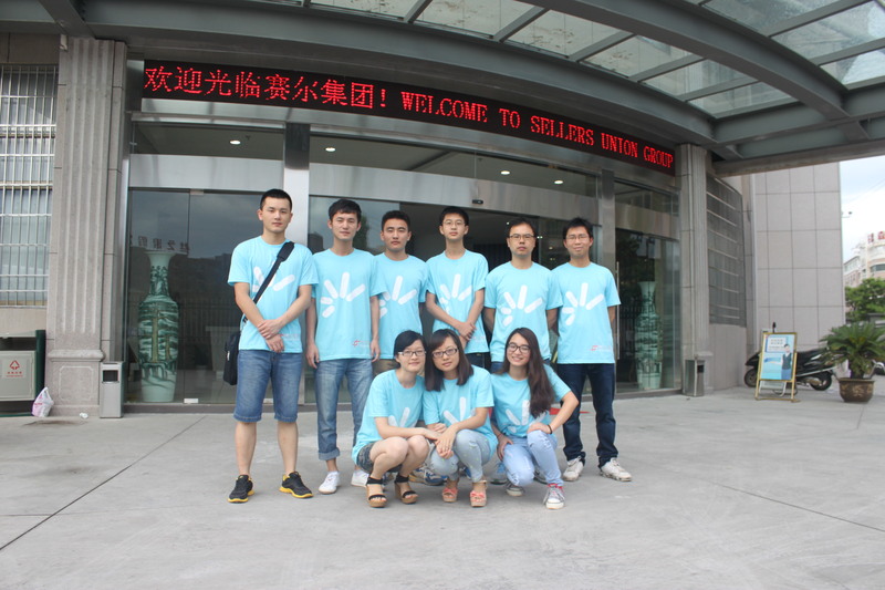 九位志愿者在公司大樓前集合
