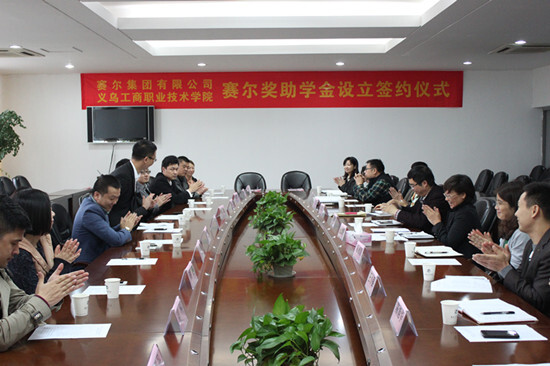 賽爾網訊  11月12日下午,我集團“賽爾獎助學金”設立簽約儀式在義烏工商學院舉行。集團副總裁錢天鋒、總裁助理喻進、行政副總監龔江民及各子公司總監,工商學院副院長何少慶、學生處處長金慧萍、經管分院院長趙紅英及外語外貿分院老師共同出席了本次簽約儀式。