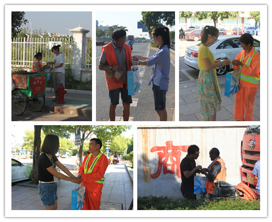 夏季的臺風沒有阻止住滾滾的熱浪,高溫下涌動的車流總是那么匆忙。在不經意間揮汗如雨、默默工作的身影闖進了我們的視線。一頂樸實的草帽,一身鮮亮的橘黃色外衣,一輛藍黃相間的三輪車,他們就是城市最辛勤的美容師——環衛工人。