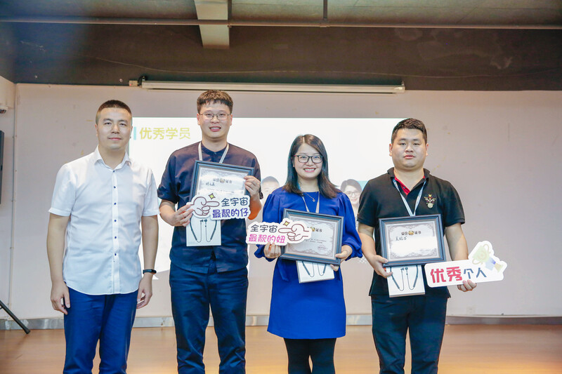 課程復盤和結業匯報結束后,學院舉行了簡單又歡快的頒獎儀式。根據對各學習小組、各學員一年來參與培訓情況及培訓成效的綜合計分,優越公司葛曉青、優訊公司吳旺龍和優景公司胡云再被評為本期優秀學員,青云三組被評為優秀團隊。集團總裁助理喻進、優達公司總經理方保軍、優騰事業部總經理徐生科分別為優秀團隊、優秀學員頒獎。