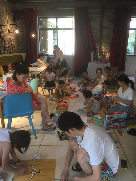 8月4日,天氣晴朗,優(yōu)景公司第一屆親子活動在大步里院拉開了序幕。共有13組家庭報名參加,其中3-5歲的寶貝居多。早上9點半,大家陸續(xù)來到大步里院,孩子們一看見我們?yōu)樗麄兙臏蕚涞漠嫲濉⑺使P、印章等玩具,都迫不及待地脫掉鞋子,來到EVA墊子上,歡快地玩耍起來。