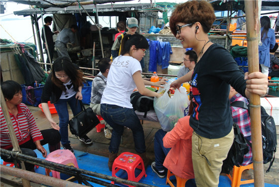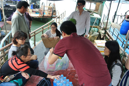 到了船上,大家首先將隨身帶來的水和零食擺放出來