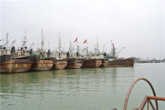 遠處,殘舊各色的漁船整齊地排列在一起