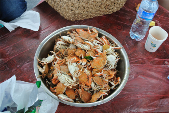 待我們上了稍帶殘舊古色的漁船,漁夫早已撒網下去。我想,這該謂之海網而非海釣吧!不一會,漁夫開始收網,各路“蝦兵蟹將”活蹦亂跳地上來了,最多的就屬小螃蟹了——嘿嘿,長得可真夠精致的!對面漁船上的童鞋們對著這邊“叫囂”,說他們的螃蟹比我們的大,我們也不甘示弱,和他們“杠”了起來。
