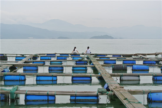 飯后,到漁船之外的木筏之上,佇立于這久違的蔚藍之中,感受著每一絲每一屢輕柔的海風。輪船駛過,道道浪花襲來,似麥浪。坐在木筏上凝視遠方的美麗女子,突然對我們回眸一笑,“最是那一低頭的溫柔,恰似一朵水蓮花不勝涼風的嬌羞”,是此時此景最美的寫照。快上岸時,天空飄起了小雨點,這是江南煙雨么?美哉!