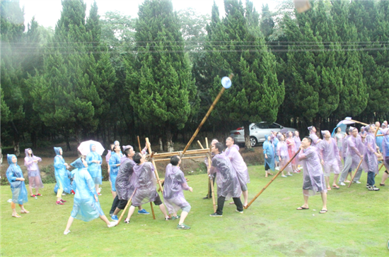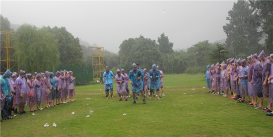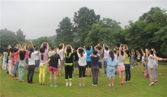 第二天早餐之后,我們100多號(hào)人在草地圍成2個(gè)同心圓,女生外圈,男生內(nèi)圈。大家手拉手站立,在教練的帶領(lǐng)下開(kāi)始熱身活動(dòng)。
