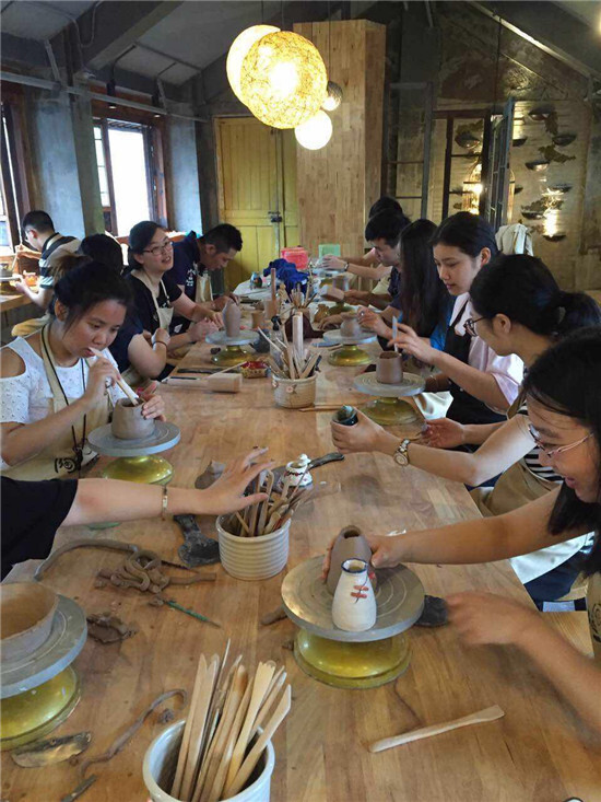 一邊在游覽,另一邊的寧波講師們已到達南塘老街手工陶藝體驗館——陶一天。進館以后,大伙系上圍兜,拿起工具,大展身手,一個個簡直就是藝術家附體,美美地創作著自己所愛的各式花瓶。