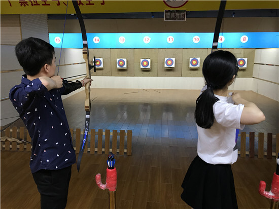 午餐過后,大家便來到了甬道順豐射箭館,體驗(yàn)射箭的樂趣。在經(jīng)過教練簡單的輔導(dǎo)之后,小伙伴們一個個有板有眼地拉起了弓,瞄準(zhǔn)靶子射箭。結(jié)果由于弓弦太緊,放箭的時候總是會手抖,導(dǎo)致箭常常射偏,有的正中靶心,也有的射到了墻上,最終Linda童鞋以其健壯的臂力拔得頭籌!
