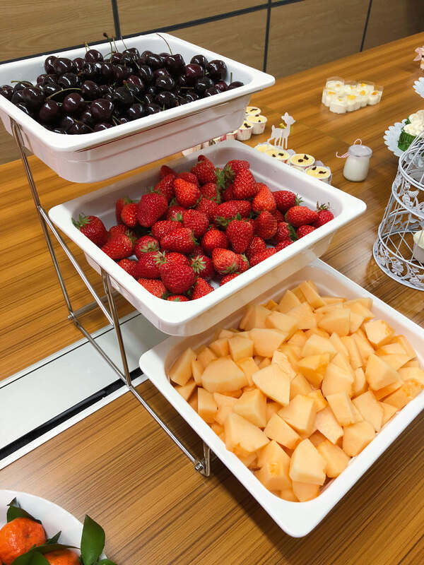 當(dāng)女生們還沉浸在收到鮮花禮品的喜悅中時,精美的下午茶便出現(xiàn)在大家眼前,數(shù)十種甜品,加上車?yán)遄硬葺芄系雀鞣N水果,惹得集體男同胞們羨慕不已。幾分鐘后,所有美食被一掃而空,真是滿足。