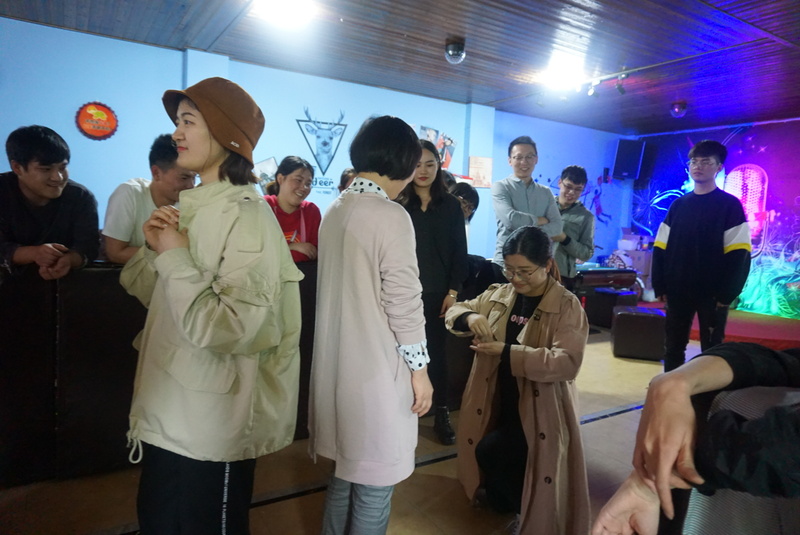 廚藝展示和午餐結束,大家在酒吧間休憩片刻后,玩起了“有口難言”的游戲:第一個人接收到策劃組的詞后只能通過肢體動作傳遞給下一個人,由最后一人猜詞。為了讓大家彼此間可以更加熟悉,我們進行了重新分組。每個組都會有一兩個游戲黑洞,讓原本很好猜到的詞語變得難度加倍,下一個成員也只能一臉懵逼地把動作接著傳遞,在局內比劃的人確實是有口難言,但是旁觀的人早已捧腹大笑。