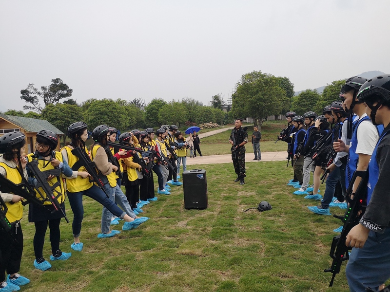 最后我們玩了期待已久的真人CS,大家很是興奮,穿戴好裝備就迫不及待做出射擊的姿勢,黃隊與藍隊互不相讓。在玩到第二局的時候開始下起了雨,但大家依舊興致勃勃。除了活躍的男生以外,女生也毫不示弱,躲在各種掩體后面,隨時準備把“敵軍”剿滅,氣氛緊張又刺激。