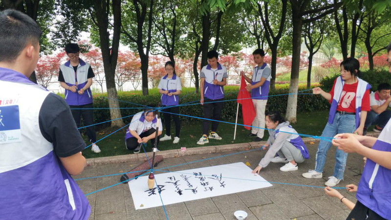 接下來就是正式開始的拓展游戲——團(tuán)隊(duì)用毛筆書寫字幅,該項(xiàng)游戲考驗(yàn)團(tuán)隊(duì)隊(duì)員的組織協(xié)調(diào)力和耐心。數(shù)10根繩條只要有一個(gè)隊(duì)員分心,整個(gè)書寫行動(dòng)便難以行進(jìn)。三組隊(duì)員的認(rèn)真協(xié)作獲得了拓展教練的一致好評。