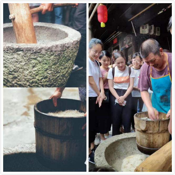 游戲過后,大家開始體驗外婆坑的特色項目:打麻糍和磨豆漿。打麻糍雖然看起來簡單,可是當大家上手體驗之后才發現這個體力活一般人可是無法勝任。搗爛后的糯米裹上紅糖或咸菜,麻糍就這樣新鮮出爐啦。浸泡過的大豆混水倒進石磨口,推動石磨轉起來,豆汁就徐徐地流出。體驗一把磨豆漿再喝上現做的豆漿,感覺這豆漿特別醇正。