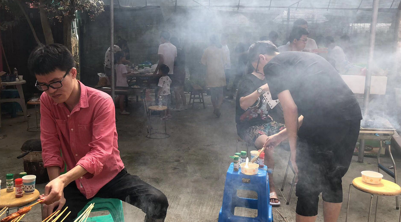 中午,大家一起在邊上不遠處的紅興家庭農(nóng)場舉辦了自助燒烤。也許是剛打完CS急需補充能量,也許是燒烤的小伙伴技術精湛,也許是食材太過豐富多樣,也許是大家在一起吃喝玩耍,大家都吃得格外的香,格外的開心。