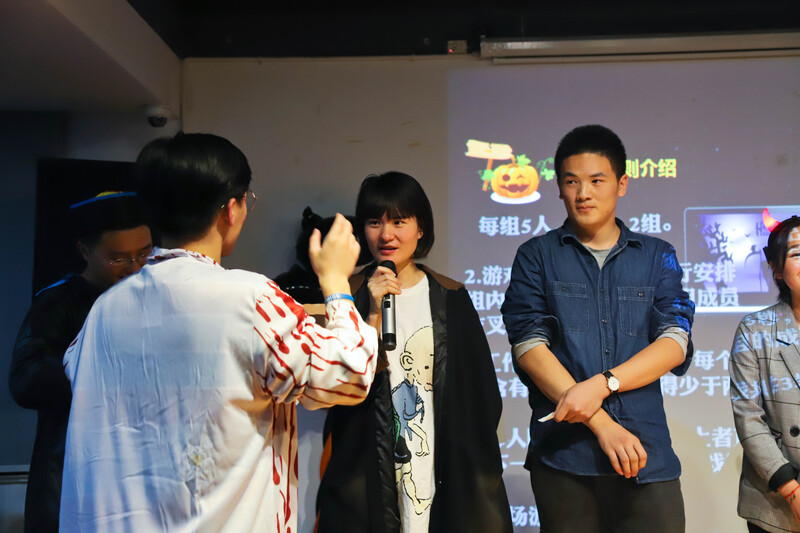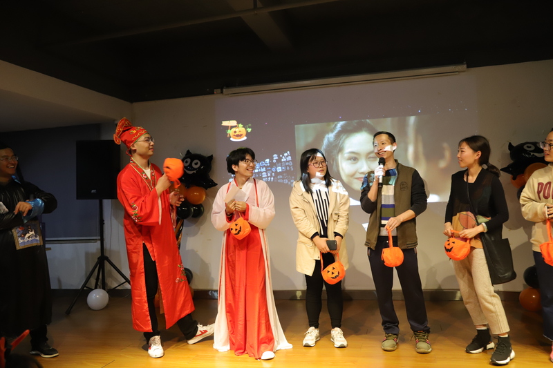 萬圣節怎么可以少了trick or treat 的樂趣呢?一進門,身著女巫斗篷的工作人員就為每位入場的朋友分發了炫彩糖果。身著血淋淋醫生服和搞怪僵尸服的兩大男主持宣布活動開場。話音剛落,由舞蹈社社長陳雪君扮演的白衣女鬼帶領兩大門鬼及兩位男主持貢獻了詭異又搞笑的開場舞,瞬間活躍起了現場氣氛。