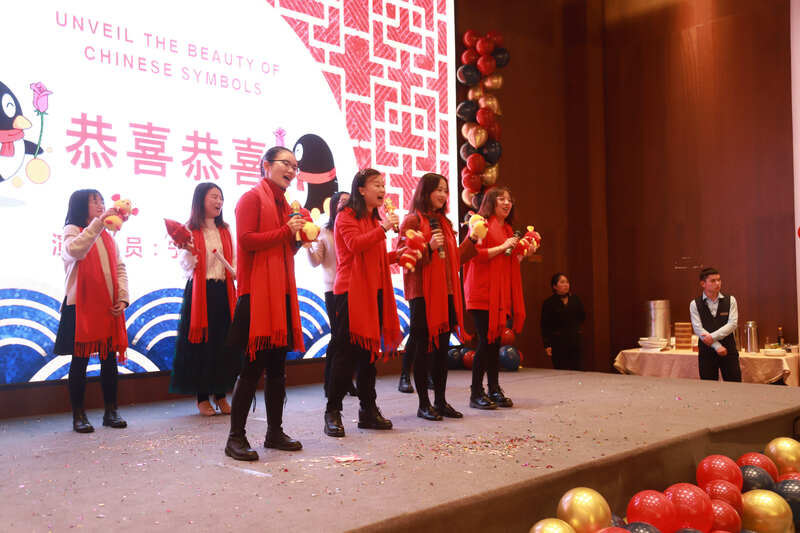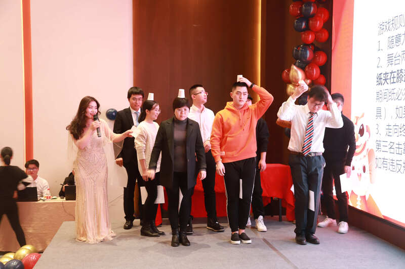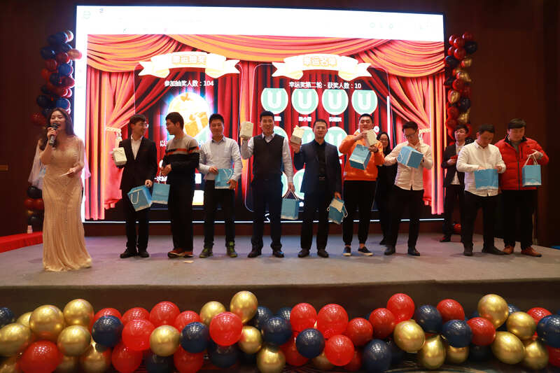 會議結束后,大家陸續到達晚宴地點。一進門,就看到兩位大財神正捧著金元寶在發入場紅包,場地的桌椅都鋪上了喜慶的大紅布,伴著《新春序曲》的音樂,年會的熱鬧勁兒撲面而來。晚會上,小人舞、3D游戲、抖乒乓球比賽、熒光舞、驚喜環節、相聲合唱不一而足,頗具新意。當然晚會也少不了各種抽獎活動,幸運大屏滾動,每個小伙伴彼時都希望自己成為幸運的錦鯉,而不定時的搶紅包環節更是讓現場伴隨著陣陣尖叫。