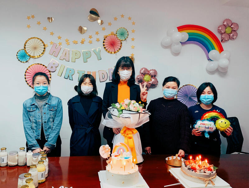 陽春三月匆匆而過,眨眼四月也已到中旬。4月15日,在這個喜氣洋洋發(fā)工資的好日子里,財務(wù)管理部迎來了第一個小活動——給本月的壽星彩姐、王彬彬、謝冰清、彭金秀、陳菲籌備集體生日宴。偷偷裝扮好小會議室,準備好可口的糕點和飲料,大家一窩蜂地把壽星們擁入會議室,點好蠟燭,關(guān)上燈,一起異為他們唱生日快樂歌,許愿合影留念,氛圍非常歡樂。雖然大家都戴著口罩,但是眉眼處顯露的笑容卻是藏也藏不住。