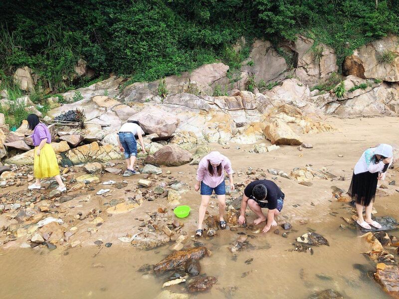 到達海邊民宿后,大家迫不及待地放下行李,分頭去海邊玩耍。有些人開始放桿釣魚,有些人便在巖礁抓螃蟹挖貝殼,大家放肆地挽起褲腿,放下平日的矜持,找到一塊好看的海螺便立刻呼朋引伴,邀請他們前來觀看。