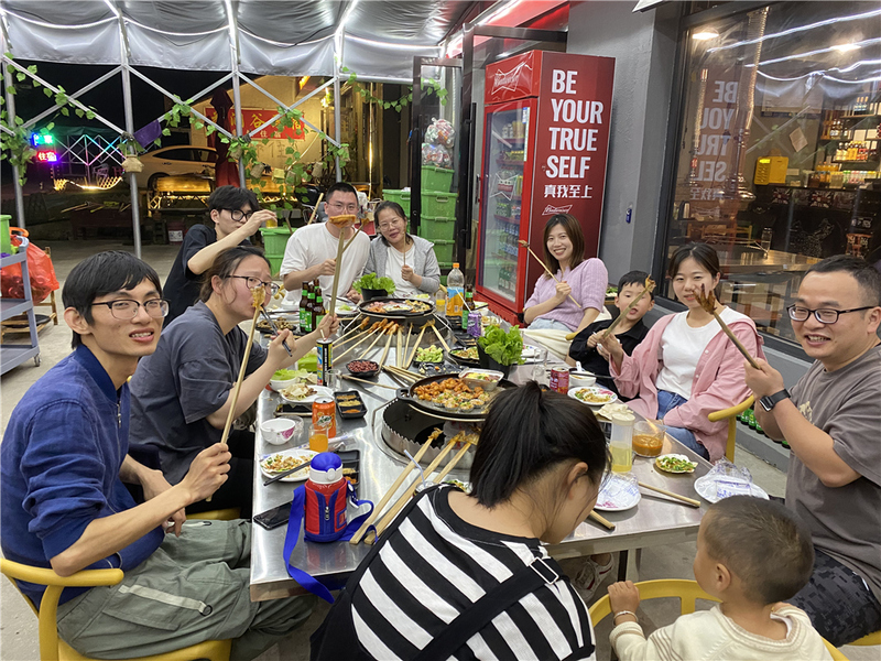 晚上,我們在民宿附近的燒烤店解決了晚餐,點了一桌美食,同事們拋開工作中生活中的煩惱,暢聊了起來。