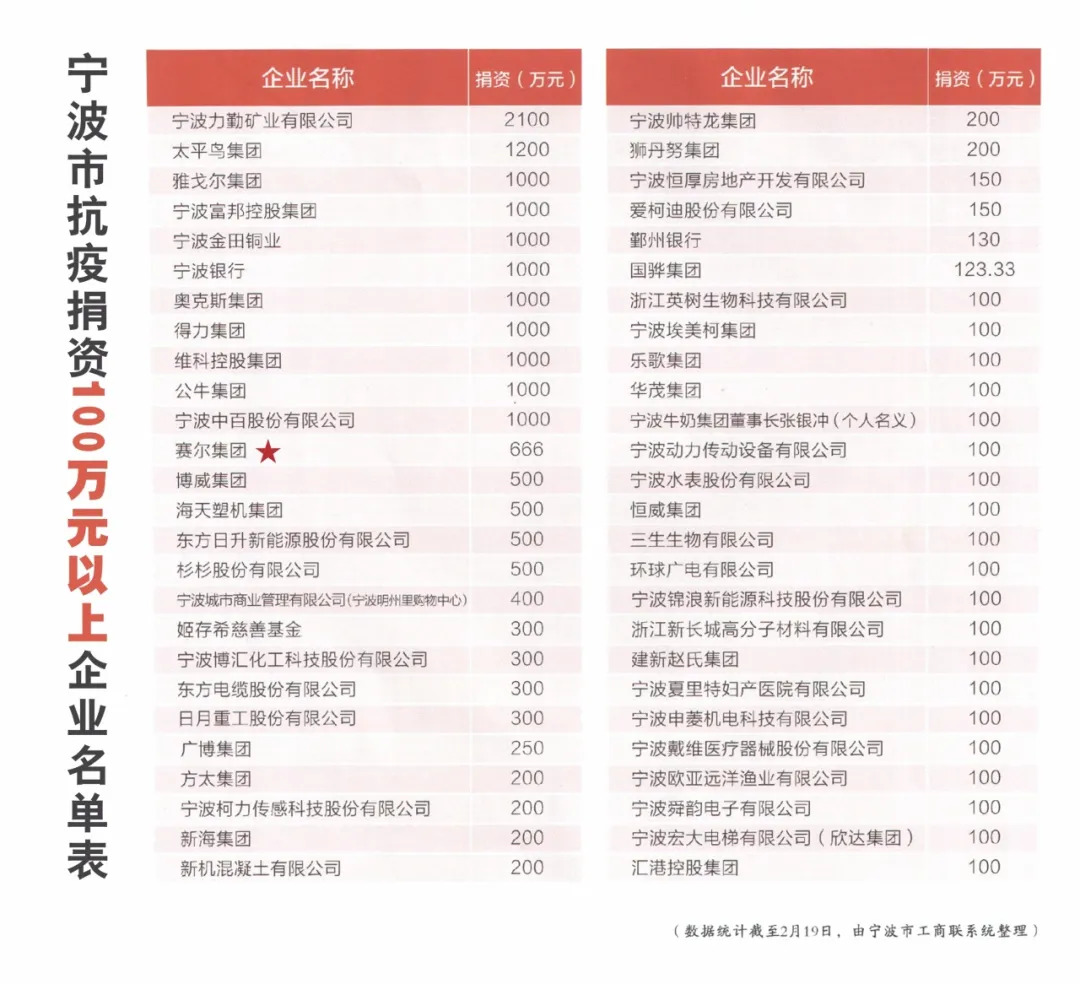 2020年,向寧波慈善總會捐贈10萬元,資助寧波星寶自閉癥家庭支援中心。2月,徐平炬個人捐贈30萬元用于抗擊新冠疫情。2月,集團捐贈666萬元支持寧波市、義烏市(兩地各333萬元)抗擊新冠疫情。12月,徐平炬向浙江省民建紅十字思源幫扶救助基金捐款200萬元。